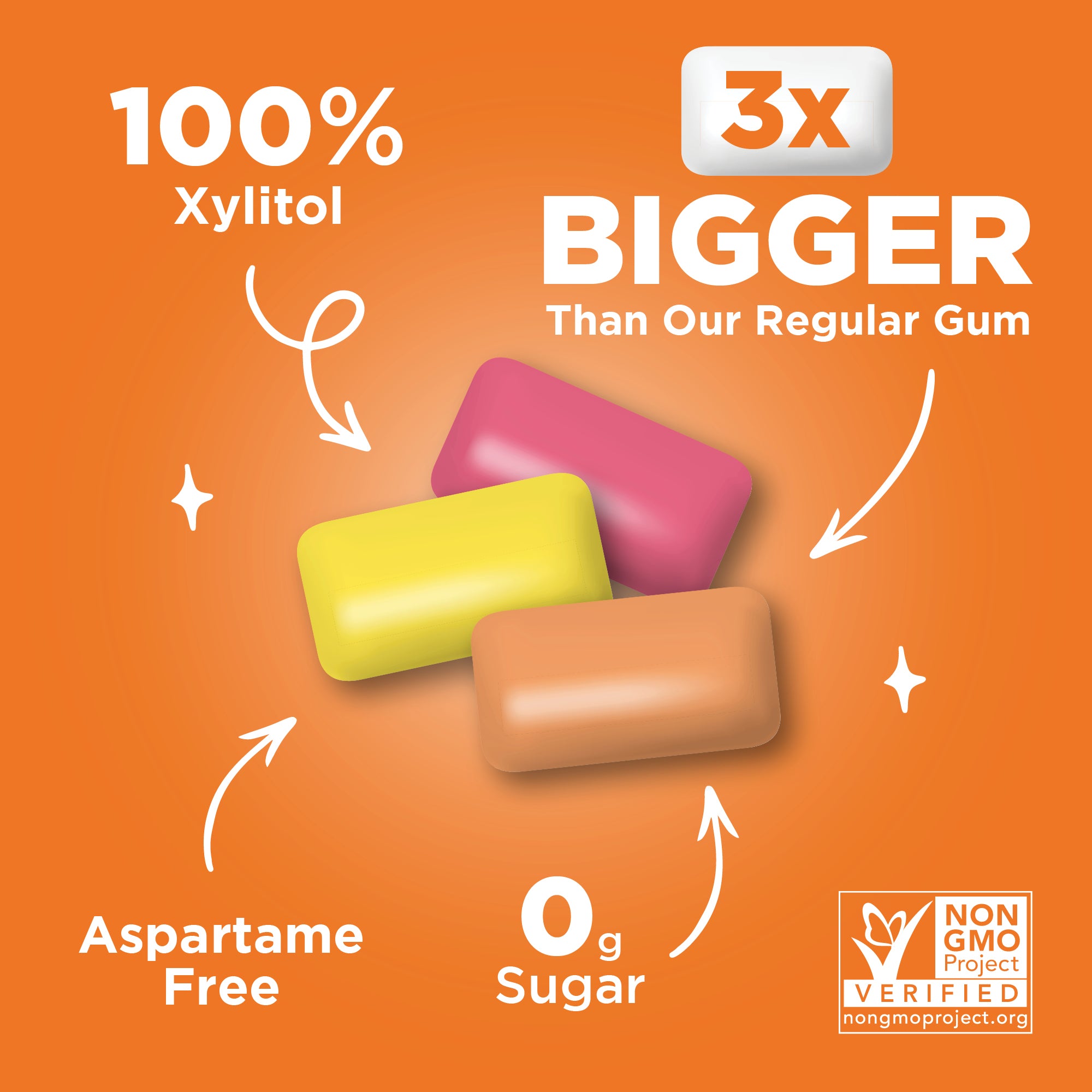 Experience the satisfying chew of our Jumbo gum! Each piece of Jumbo gum is 3x the size of a regular chiclet, to give an unparalleled chewing experience. Enjoy strawberry, banana, and orange flavours in every resealable bag.